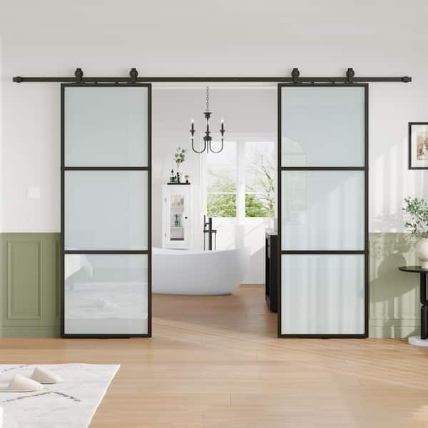 60 in. x 84 in. (Double 30 in doors) 3 Lite Frosted Glass Black Metal Frame Interior Sliding Barn Door with Hardware kit