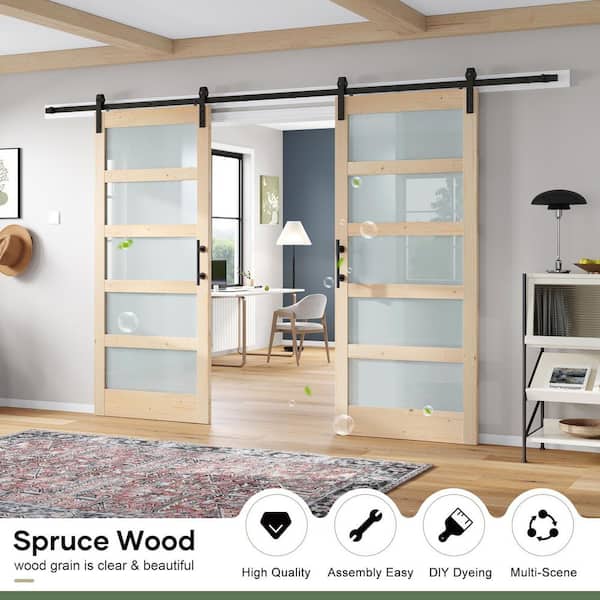 64 in. x 84 in. (Double 32 in.) 5 Lite Frosted Glass Spruce Finished Solid Wood Sliding Barn Door with Hardware Kit