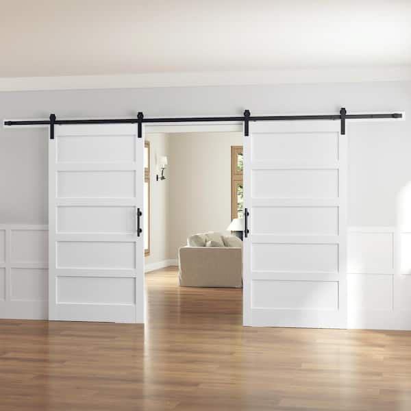 84 in. W. x 84 in. (Double 42 in. Doors) 5-Panel Solid MDF White Finished Interior Sliding Barn Door with Hardware Kit