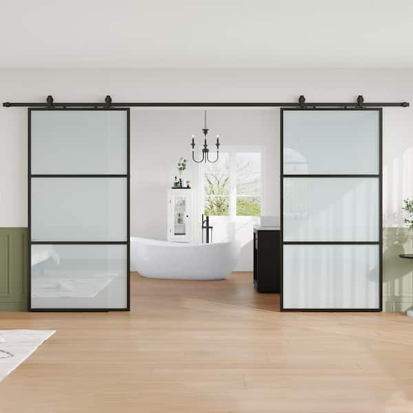 84 in. x 84 in. (Double 42 in doors) 3 Lite Frosted Glass Black Metal Frame Interior Sliding Barn Door with Hardware kit