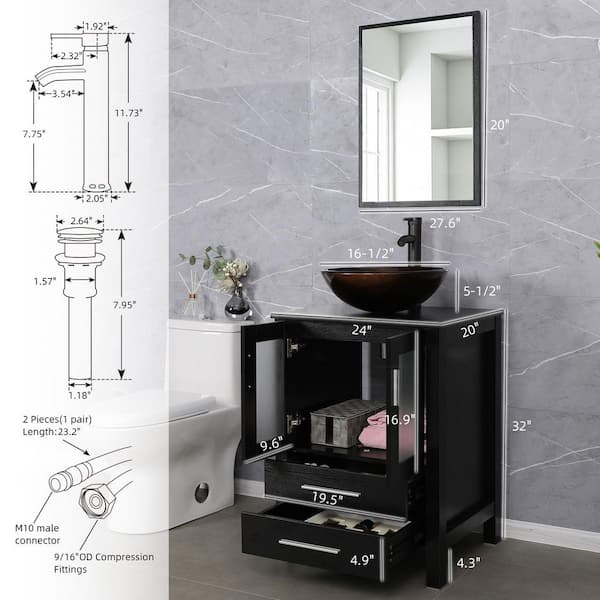 24 in. W x 20 in. D x 32 in. H Single Sink Bath Vanity in Black with Brown Glass Vessel Sink Top ORB Faucet Set