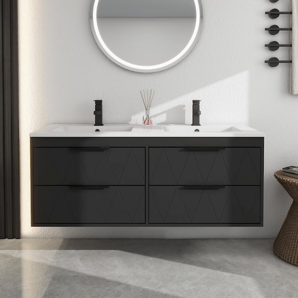 48 in. W x 18.1 in. D x 18.1 in. H 2-Sink Bath Vanity in Black with White Resin Top and Drain Faucet Set