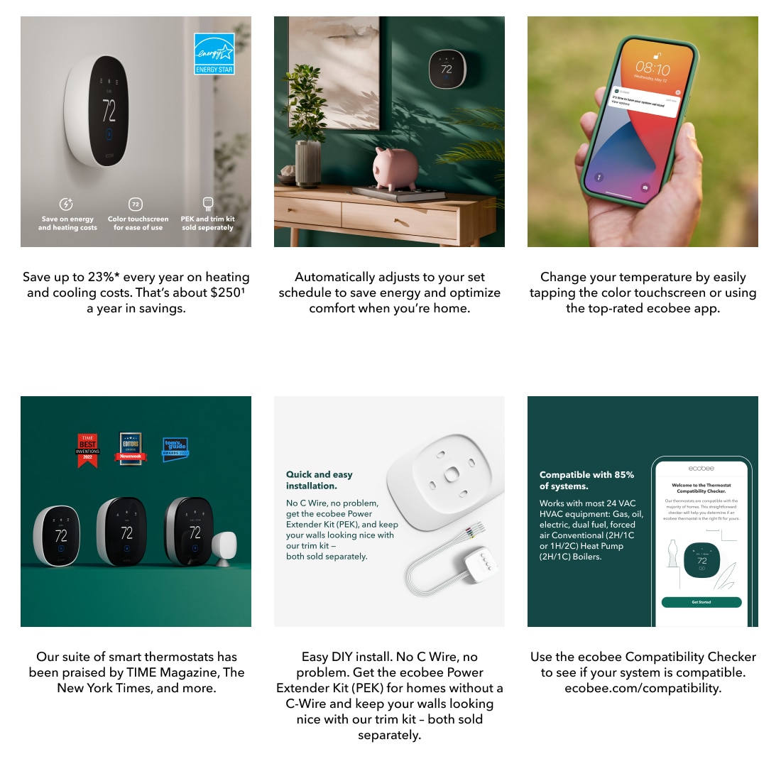Join the millions who love and trust ecobee products with our most affordable thermostat yet: Smart Thermostat Essential. It saves you up to 23%* on your energy bills and is so efficient that it pays for itself in just six months. You'll love how easy it is to use and control, and with effortless installation, you can set it and forget it.*Compared to a hold of 72°F/22°C.