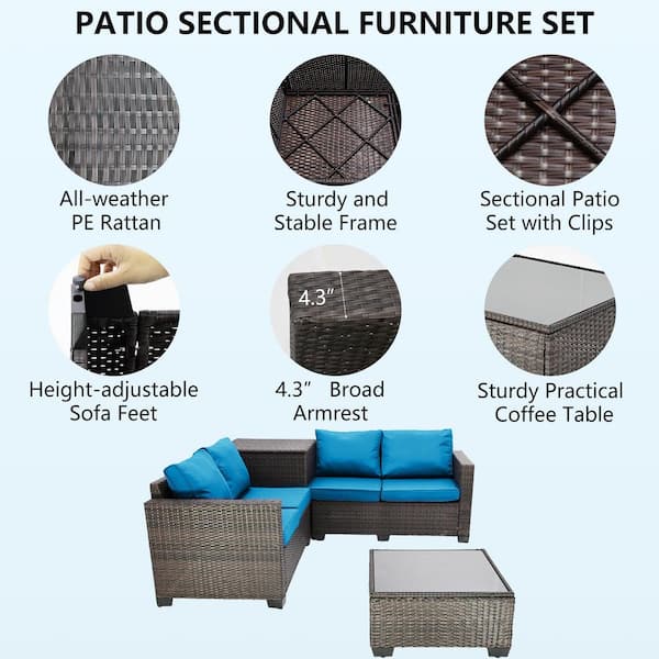 4-Piece Patio Wicker Sectional Sofa Set with Dusty Blue Cushions, Storage Box and Glass Coffee Table