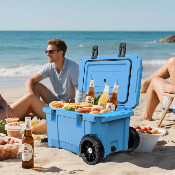 Light Blue 55 qt. Portable Chest Cooler, Leak-Proof Outdoor Insulated Cooler with Handle and Wheels, Bottle Opener