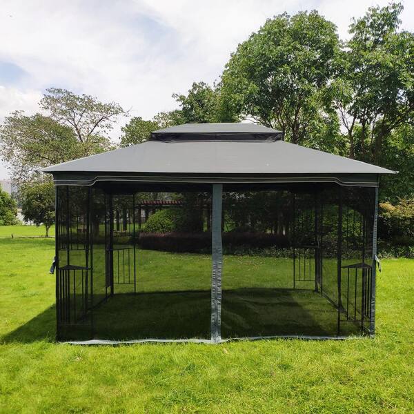 13 ft. x 10 ft. Outdoor Gray Metal Frame Patio Gazebo Canopy Shelter with Double Canopy and Netting