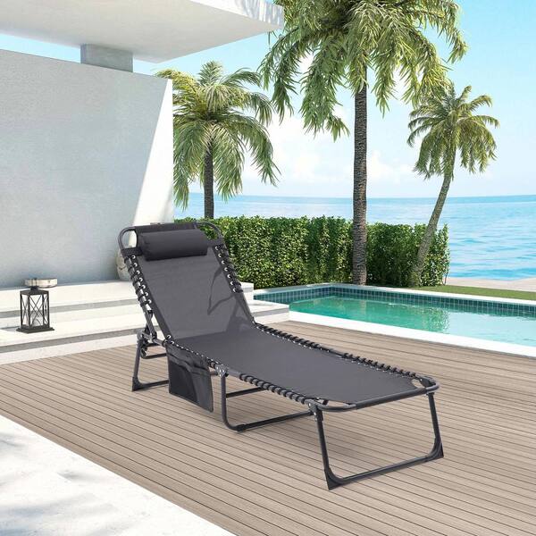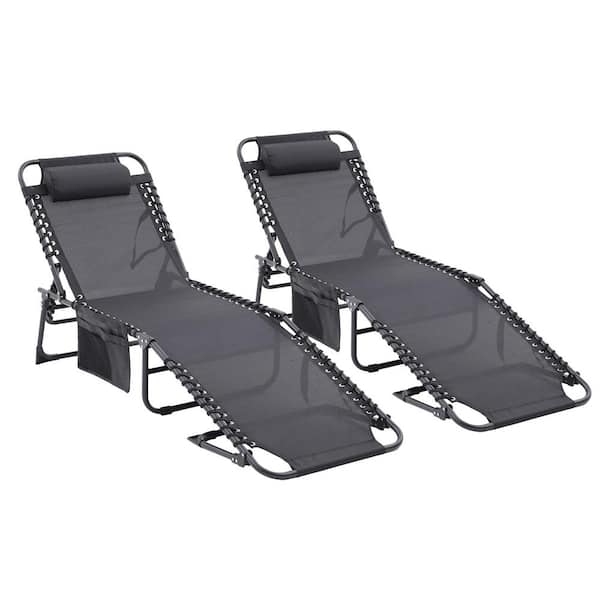 2-Piece Black Metal Outdoor Chaise Lounge with Pocket and Pillow, Adjustable Backrest for Lawn, Sunbathing and Beach