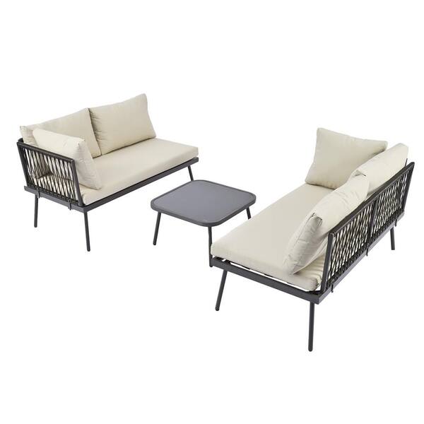 3-Piece Wicker Outdoor Sofa Set All Weather Patio Metal Sectional Set with Beige Cushions and Glass Table