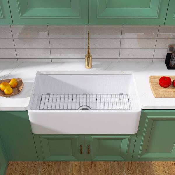 30 in. Farmhouse/Apron-Front Single Bowl White Fireclay Kitchen with Bottom Grids and Strainer Basket