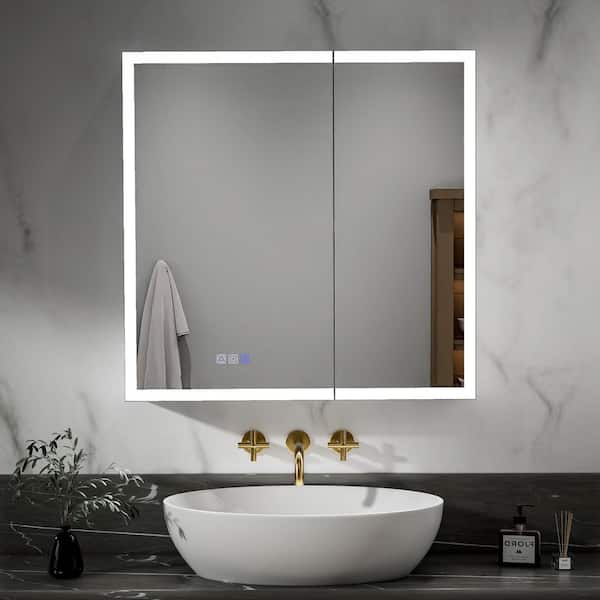 30 in. W x 30 in. H Rectangular Silver Aluminum Recessed/Surface Mount Dimmable Medicine Cabinet with Mirror Defogging