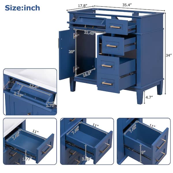 35.4 in. W Bath Vanity Cabinet without Top in Blue with 3-Drawers and 2-Doors, Flip-Out Drawer