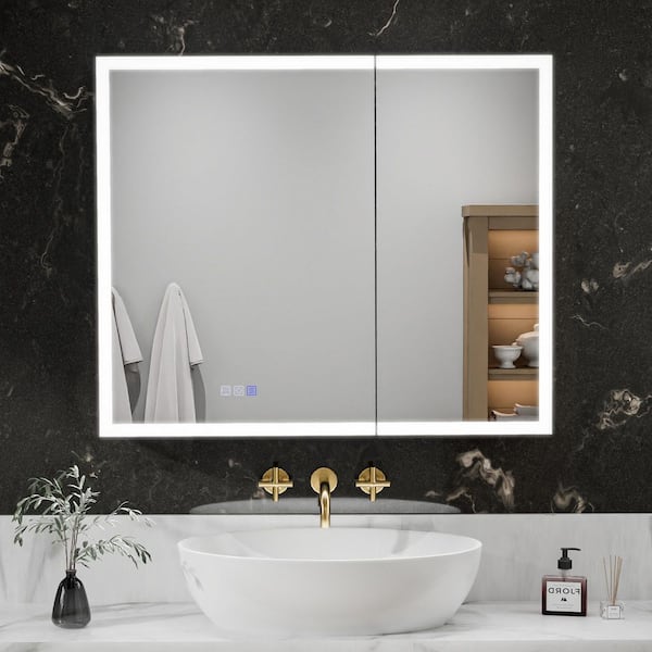 36 in. W x 30 in. H Rectangular Silver Aluminum Recessed/Surface Mount Dimmable Medicine Cabinet with Mirror Defogging