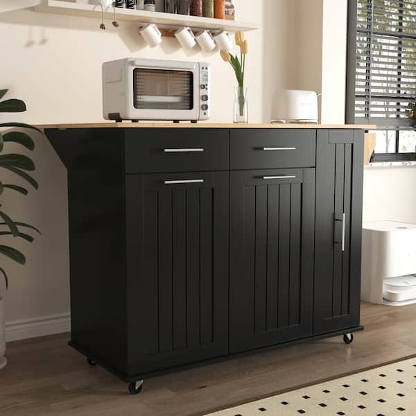 Black Wood 46 in. Kitchen Island with Drop Leaf and 3 Tier Pull Out Cabinet Organizer, Kitchen Cart with Towel Rack