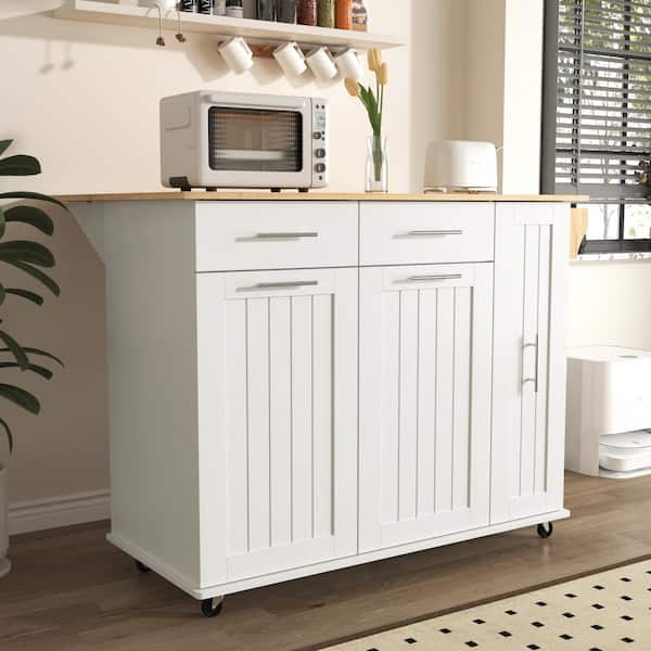 White Wood 46 in. Kitchen Island with Drop Leaf and 3 Tier Pull Out Cabinet Organizer, Kitchen Cart with Towel Rack