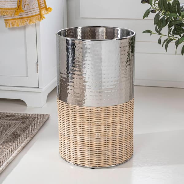 Asher Modern 4.13 Gal. 2-Tone Natural Wicker/Metal Cylinder Waste Basket, Chrome/Natural