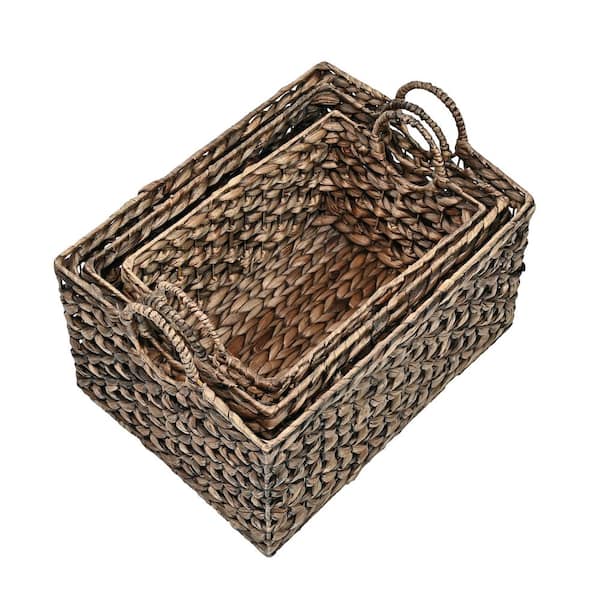 Quinn 17.72 in. x 11.42 in. Cottage Metal/Hyacinth Rectangular Storage Decorative Baskets with Handles, Brown (Set of 3)