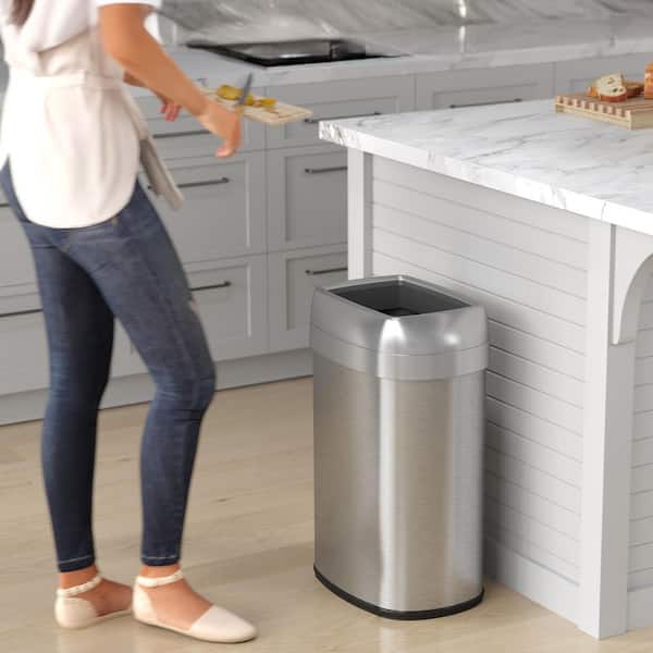 13 Gal. Stainless Steel Oval Metal Household Trash Can with Trash Sticker, Open Top, and Dual Odor Filters