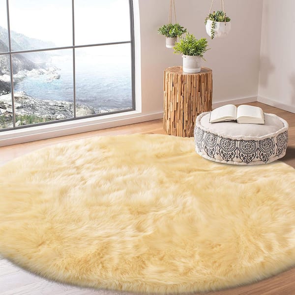 Faux Sheepskin Fur Pale Yellow 8 ft. Round Fuzzy Cozy Furry Rugs Area Rug
