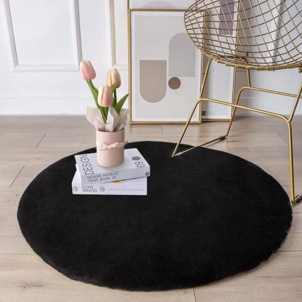 Mmlior Black 3 ft. x 3 ft. Soft Faux Rabbit Fur Round Area Rug