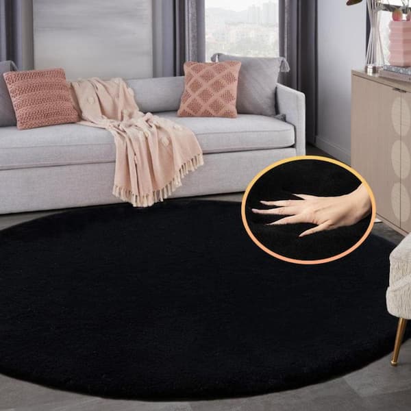 Mmlior Black 8 ft. x 8 ft. Soft Faux Rabbit Fur Round Area Rug