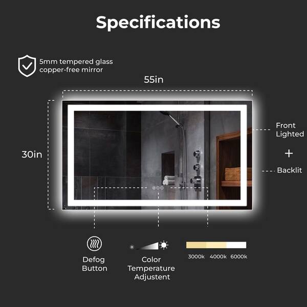 50 in. W x 32 in. H Rectangular Frameless Anti-Fog LED Light Wall Bathroom Vanity Mirror