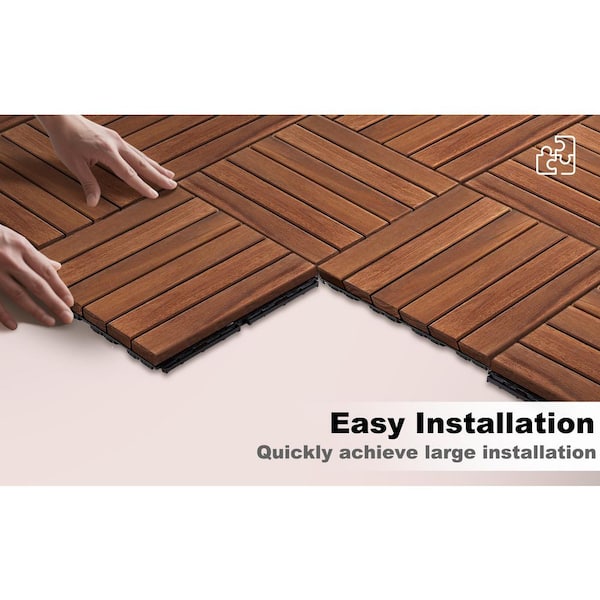 10-Pieces Interlocking Deck Tiles Striped Pattern 12 x 12 in. Square Acacia Outdoor Flooring for Patio Balcony Pool Side