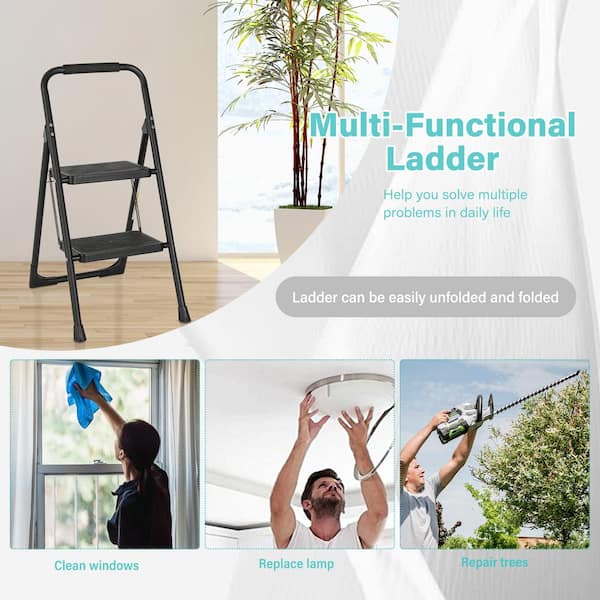2.5 ft. Reach, 2-Step Iron Ladder, Black Foldable Non-slip Outdoor Ladder 330 lbs. Load Capacity for Home, Office
