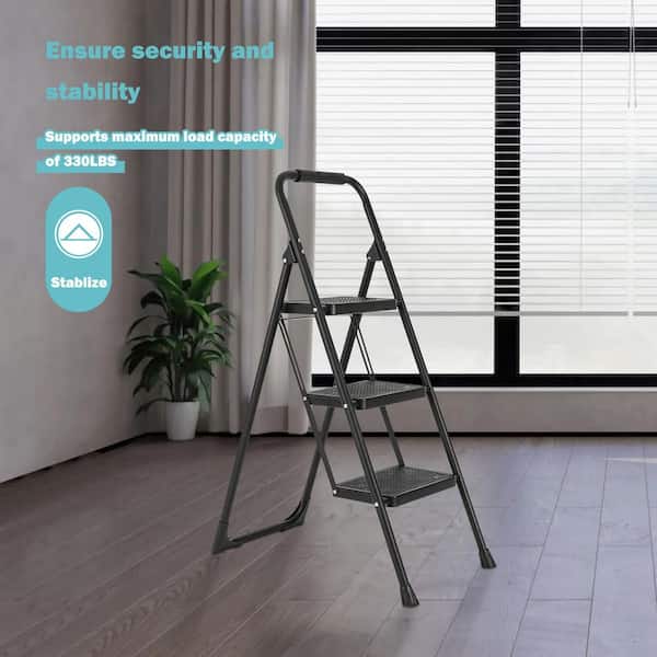 3.4 ft. Reach 3-Step Iron Ladder Foldable Non-Slip Outdoor Ladder Loading 330 lbs. for Home, Kitchen, Office, Black