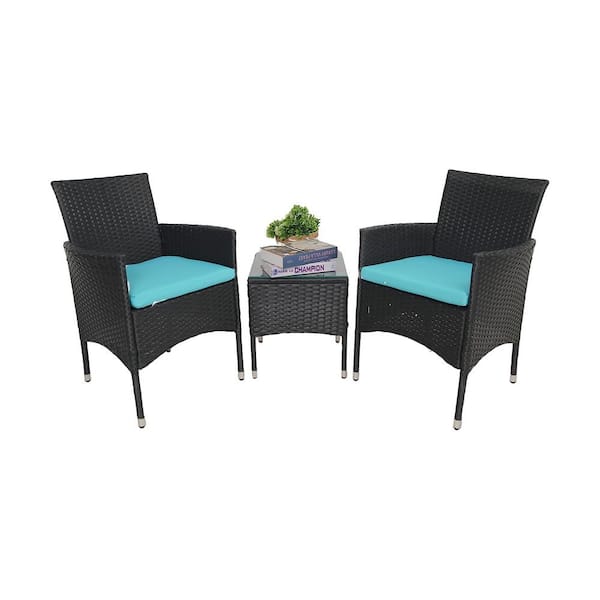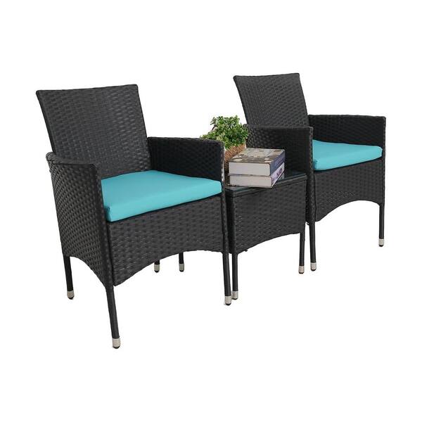 3-Piece Black Wicker Patio Conversation Set with Blue Cushions