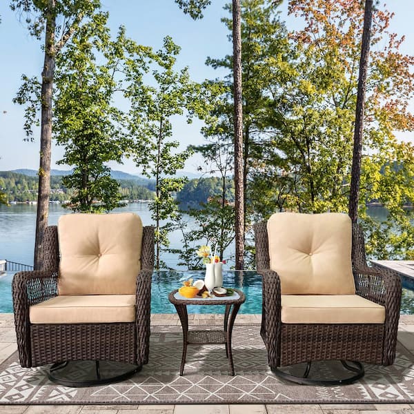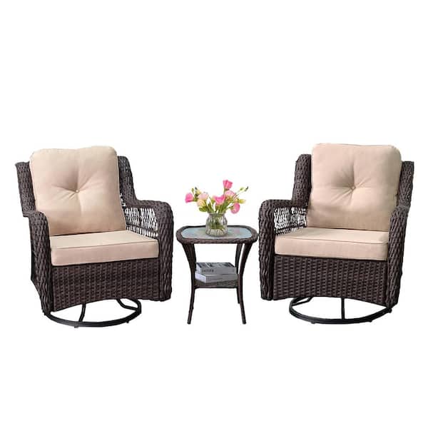 3-Piece Brown Wicker Patio360-Degree Swivel Rocking Chairs Conversation Set with Brown Cushions