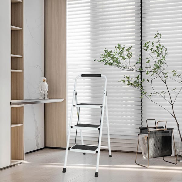 3-Step white Iron Ladder Foldable Non-slip Outdoor Ladder Loading 330 lbs. for Home, Kitchen, Office