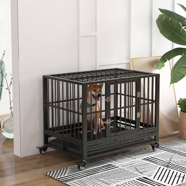 36 in. Heavy Duty Dog Crate Metal Cage Kennel with Lockable Wheels, Double Door and Removable Tray, Gray
