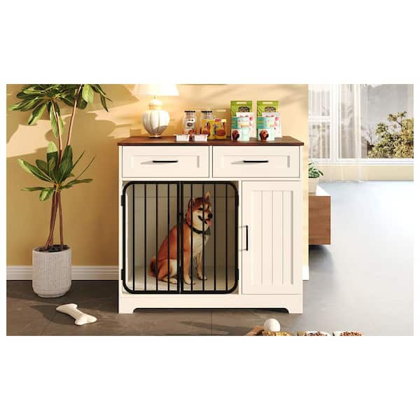 37.4 in. Dog Crate Furniture, Dog Kennel with 2-Drawers and Storage Cabinet, Furniture Dog Crate Side End Table, White