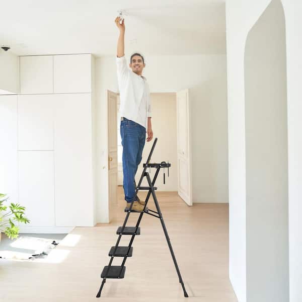 5-Step, 5.5 ft. Reach Steel Lightweight Portable Foldable Step Ladder with Tool Tray and Wide Non Slip Pedals, Handrails