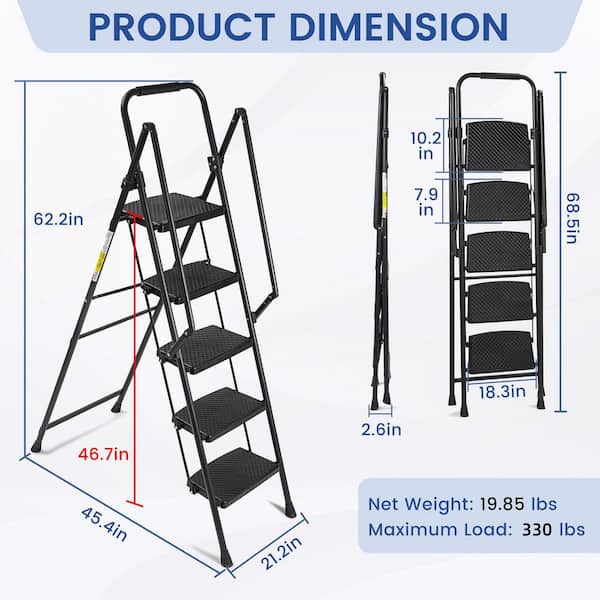 5 ft. Reach, 5-Step Folding Ladder, with Anti Slip Wide Pedals, Safety Anti Slip Handle, Lightweight Portable Step Stool