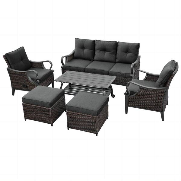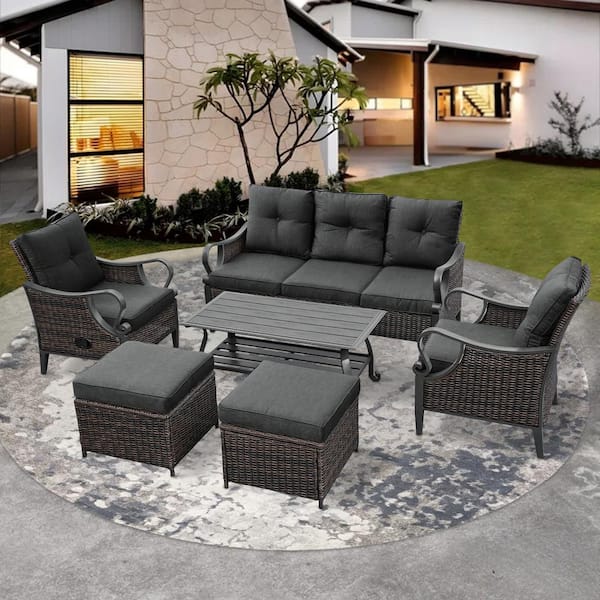 6-Piece Brown Wicker Outdoor Conversation Set with Black Cushions