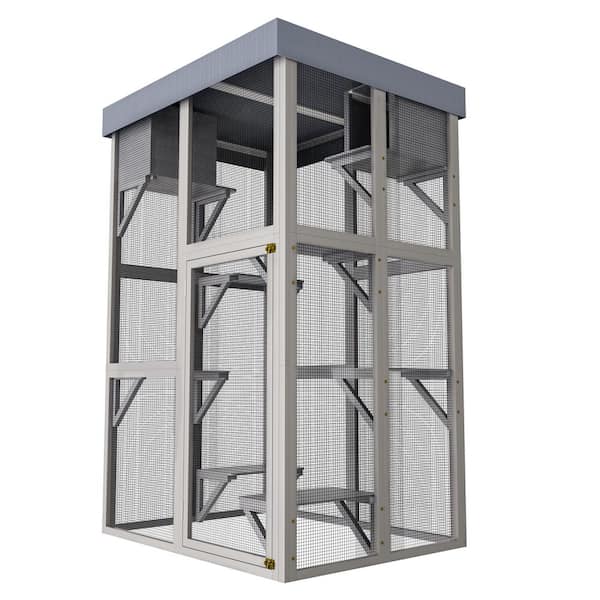 70.5 in. Tall Wooden Catio Outdoor Cat Enclosure, Gray Cat House Large Solid Wood Cage Playpen