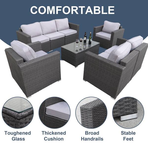 8-Piece Gray Wicker Patio Conversation Set with Light Gray Cushions