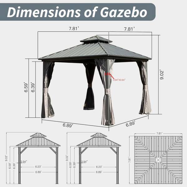 8 ft. x 8 ft. Hardtop Metal Gazebo with Galvanized Steel Double Roof Canopy, Curtain and Netting, Permanent Gazebo, Grey
