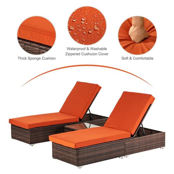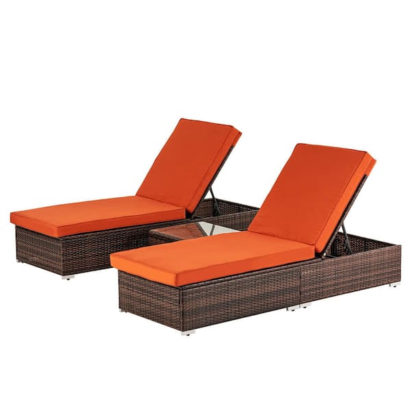 Brown 3-Piece Wicker Outdoor Chaise Lounge with Orange Cushions