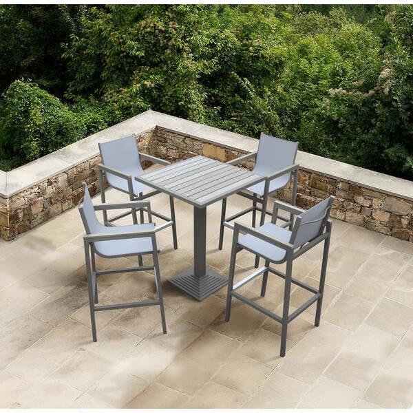 Outdoor Patio Barstool in Gray Powder Coated Finish with Sling Textilene and Gray Wood Accent Arms, Outdoor Bar Stool