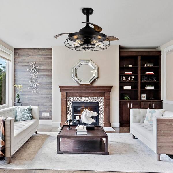 Industrial 42 in. Indoor Black Downrod Mount Retractable Ceiling Fan with Light and Remote Control