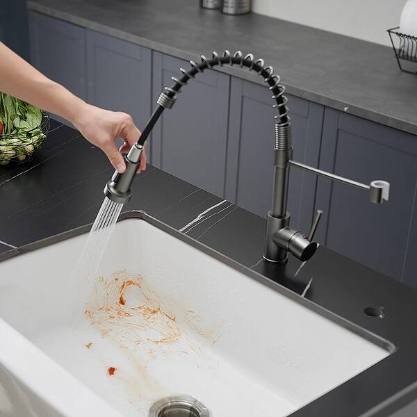 Single Handle Deck Mount Gooseneck Pull Down Sprayer Kitchen Faucet with Handles in Black