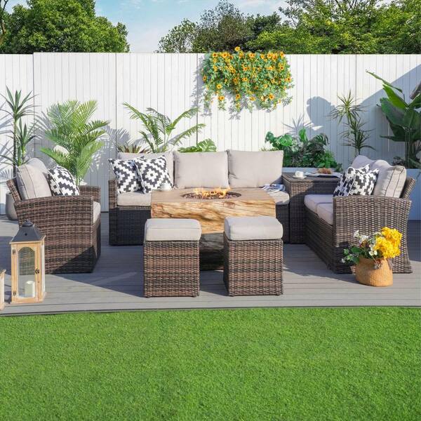 7-Piece Wicker Patio Fire Pit Seating Set with Beige Cushions