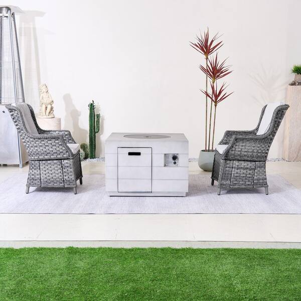Aruna 3-Piece Gray Wicker Aluminum Outdoor Fire Pit Set with Gray Cushions