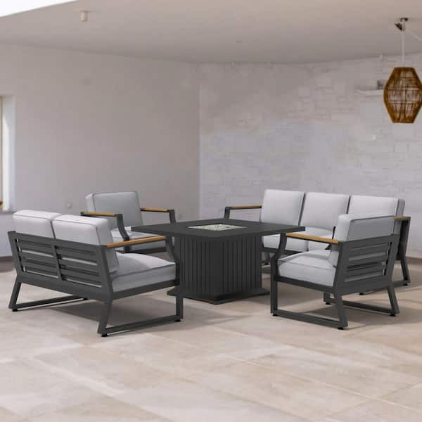 Chloe Black 5-Piece Aluminum Patio Fire Pit Conversation Set with Gray Cushions