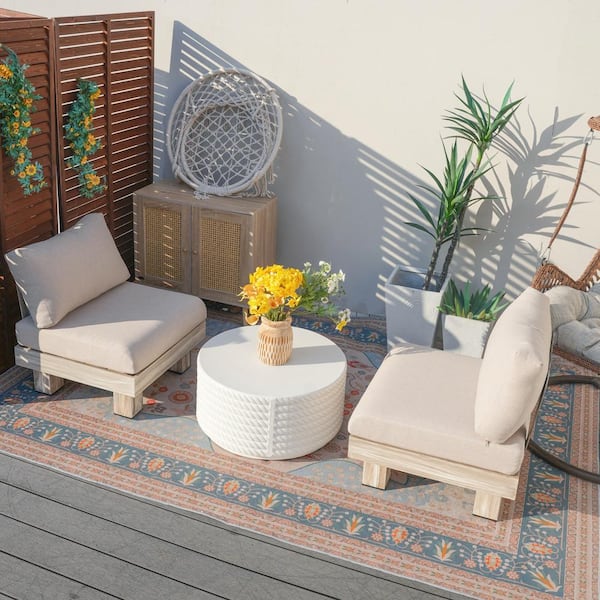 Choi 3-Piece Aluminum Outdoor Patio Wood Grain Conversation Set with White Cushions