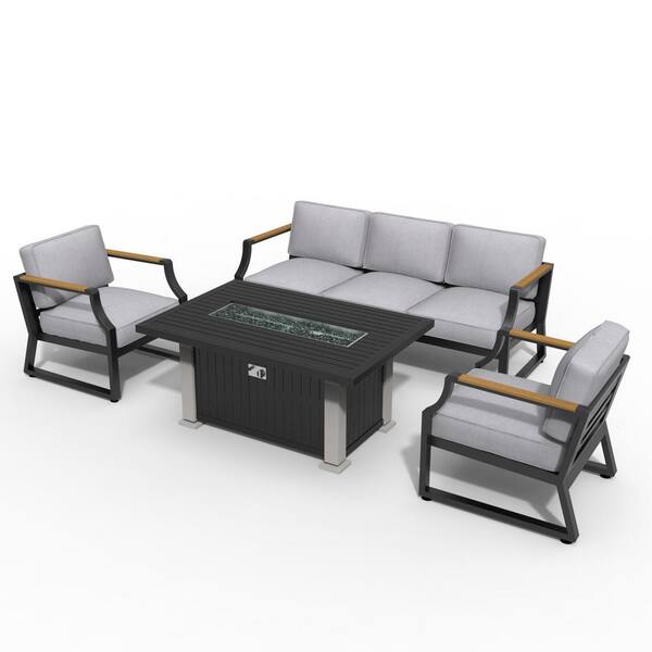 Ulrica Black 4-Piece Aluminum Patio Fire Pit Conversation Set with Gray Cushions