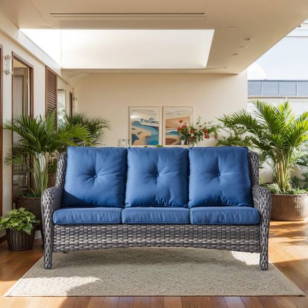 Arcline 4-Piece Gray Wicker Fire Pit Conversation Set with Olefin Blue Cushions and Couch