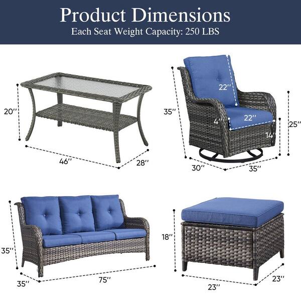 Arcline 6-Piece Gray Wicker Patio Conversation Set with Olefin Blue Cushions and Swivel Glider Chairs/Sofa
